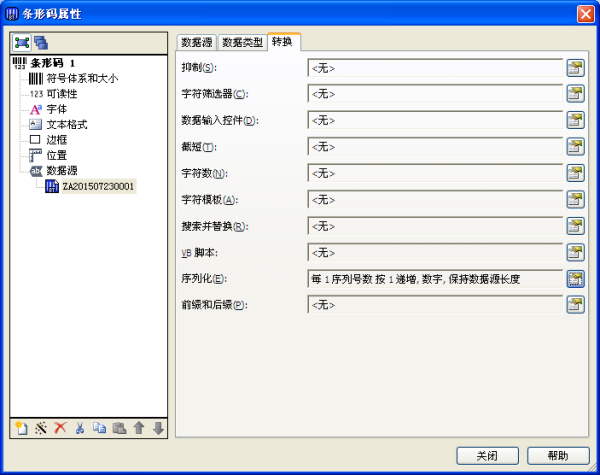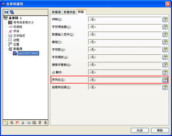 1、雙擊創(chuàng)建的條形碼,打開“條形碼屬性”對話框,單擊左側(cè)“數(shù)據(jù)源”下的數(shù)據(jù)樣本,在右側(cè)選擇“轉(zhuǎn)換”選項卡,單擊“序列化”右側(cè)的按鈕,進入“序列設(shè)置”對話框;