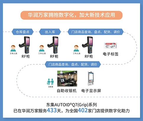 為了向顧客提供更便利的服務(wù),華潤(rùn)萬(wàn)家打造門店智能化升級(jí)。一方面通過(guò)自動(dòng)收銀機(jī)、刷臉支付、掃碼購(gòu)、電子價(jià)簽、多媒體顯示屏、電子收銀小票和發(fā)票等零售業(yè)成熟的技術(shù)來(lái)為消費(fèi)者到店、購(gòu)物、結(jié)算等環(huán)節(jié)提供便利;另一方面也為員工配備RF槍(又稱RFID手持終端)這一現(xiàn)場(chǎng)采集耐用工具,兼容華潤(rùn)萬(wàn)家移動(dòng)店務(wù)、萬(wàn)家揀貨及物流追溯軟件,讓門店員工在商品查詢、盤點(diǎn)、配貨、出入庫(kù)等日常工作中可以快速響應(yīng)。