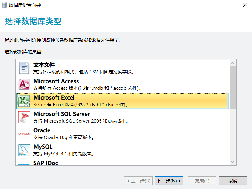 2、選擇數(shù)據(jù)庫(kù)文件的類型,下圖顯示了有Bartender可以鏈接的數(shù)據(jù)庫(kù)類型,這里我們先鏈接excel文件類型,其他的數(shù)據(jù)庫(kù)類型我們?cè)谝院蟮呐嘤?xùn)資料中再做講解