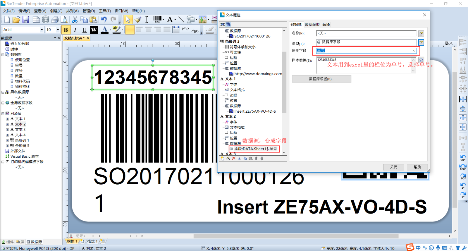 5、如何將標(biāo)簽?zāi)0逯械奈谋炬溄觘xcel文件中相對(duì)應(yīng)的字段,請(qǐng)看下圖的操作指示: