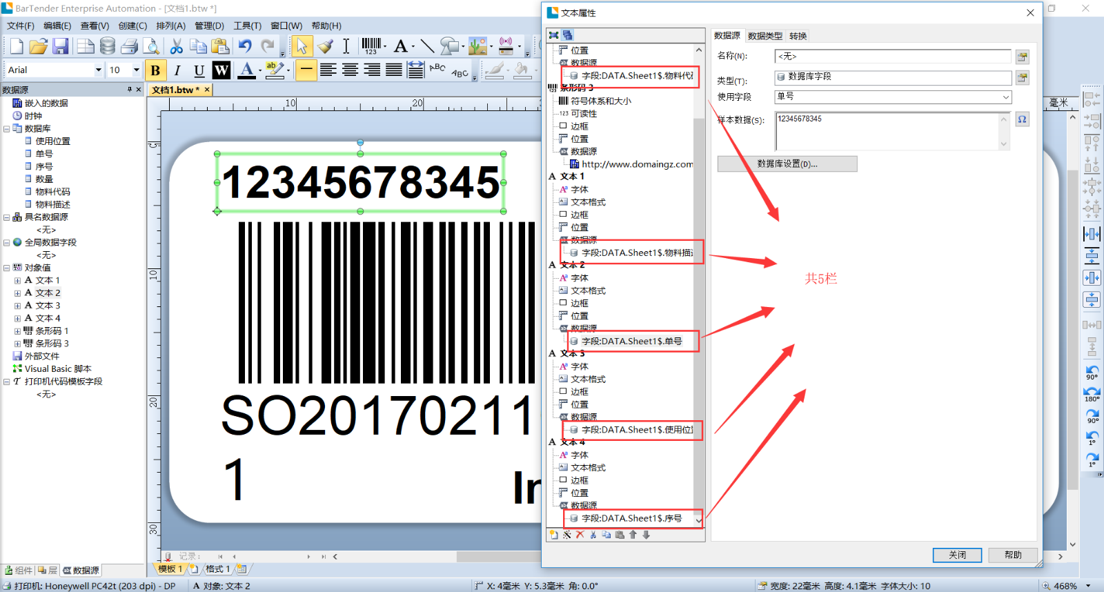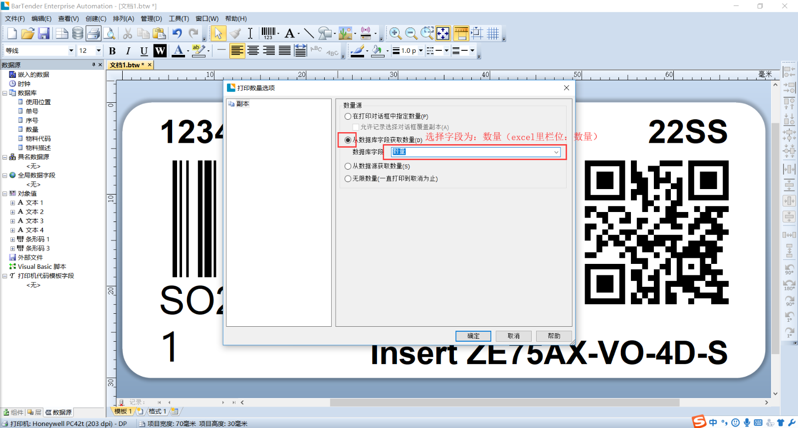 7、好了,演示標(biāo)簽的模板已經(jīng)有5個(gè)文本鏈接了excel文件里相對(duì)應(yīng)的字段了,那我們也把每行數(shù)據(jù)要打印的數(shù)量也鏈接excel文件里的“數(shù)量”字段吧,要做就做到全自動(dòng)
