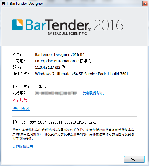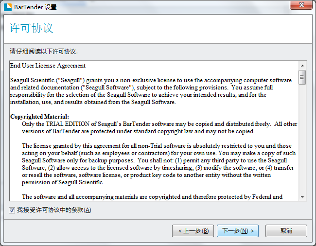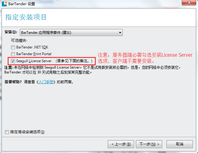Bartender 設(shè)置向?qū)?br /> 接受許可協(xié)議 選擇Bartender 版本,根據(jù)實(shí)際購買情況選擇安裝 注意:服務(wù)器端必需勾選安裝Seagull License Server選項(xiàng),客戶端不需要安裝。 直接跳過 下一步 開始安裝 如購買正版,請(qǐng)立即激活 在彈出的對(duì)話框中輸入產(chǎn)品密鑰,點(diǎn) 下一步 按提示激活產(chǎn)品 激活產(chǎn)品后,打開軟件,點(diǎn)擊 幫助>>關(guān)于 可以查看相關(guān)的激活信息 如果在上面安裝過程中沒有進(jìn)行激活的步驟,可等程序安裝完成后點(diǎn)擊 幫助>>激活此軟件 來進(jìn)行激活 (2)客戶端的安裝:基本流程跟服務(wù)器端的安裝流程一樣,只是到指定安裝項(xiàng)目的時(shí)候不需要勾選License Server這個(gè)選項(xiàng) 如果因?yàn)榉?wù)器和客戶端跨網(wǎng)段而出現(xiàn)找不到License Server的情況,請(qǐng)?jiān)诳蛻舳穗娔X上按以下設(shè)置指定服務(wù)器地址 以上就是Bartender 2016的簡易安裝指引,希望對(duì)你有幫助。 廣州領(lǐng)域條碼 Domaingz (http://m.hezx.com.cn) Bartender標(biāo)簽打印軟件專業(yè)代理,歡迎來電咨詢,本站提供的二維碼生成器也是一個(gè)方便好用的在線條碼生成工具。 軟件開發(fā)技術(shù)團(tuán)隊(duì)提供ERP條碼系統(tǒng)接口程序開發(fā),條碼標(biāo)簽打印系統(tǒng)開發(fā),我們是自動(dòng)識(shí)別應(yīng)用軟硬一體的系統(tǒng)集成供應(yīng)商。