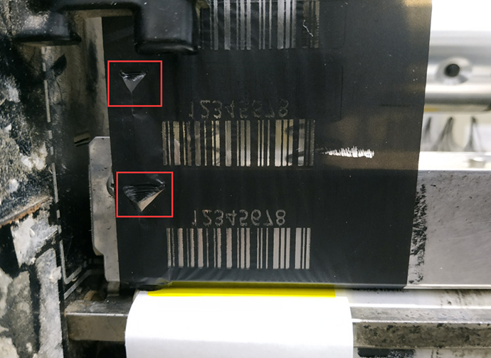 如上圖所示,每打印一張標(biāo)簽前回退時(shí)候就會(huì)出現(xiàn)碳帶倒刮的現(xiàn)象,影響打印效果。