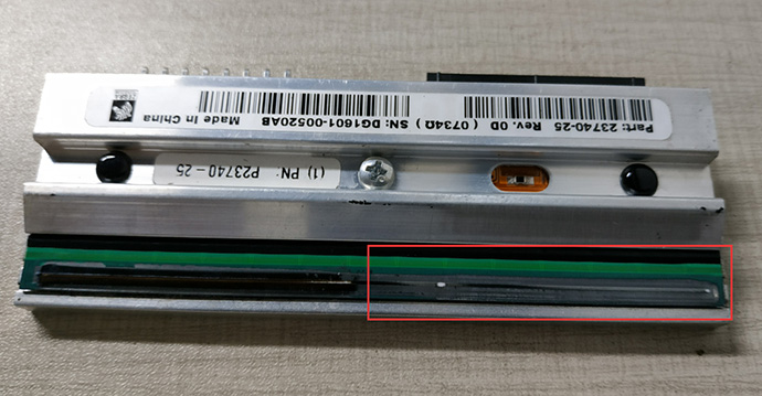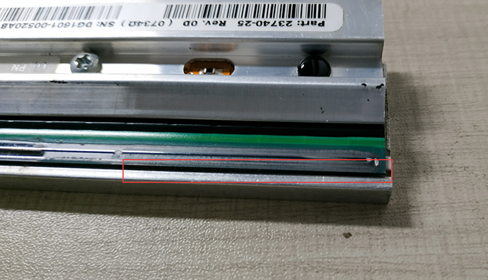 把打印頭卸下后發(fā)現(xiàn)打印頭磨損嚴(yán)重,打印區(qū)域已經(jīng)磨掉了一層,打印頭邊緣鋒利,導(dǎo)致打印的時(shí)候出現(xiàn)倒刮碳帶的情況。