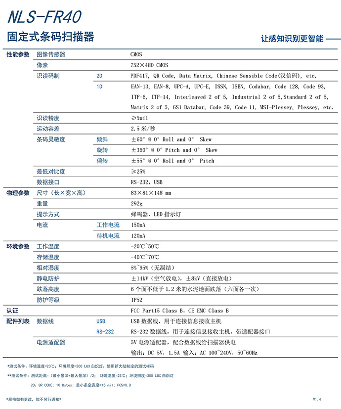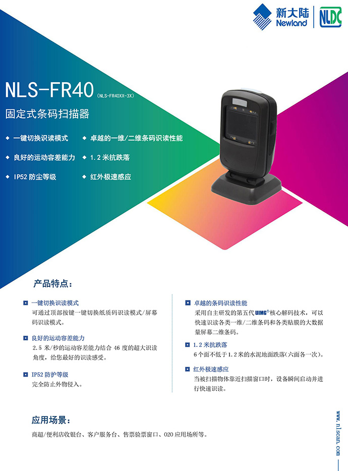 FR40系列桌面式條碼掃描器,能快速地識讀屏幕及紙張的一維或二維條碼。該型號支持RS-232/USB等PC接口,結(jié)實耐用,具有良好性價比。非常適合在超市、商場和倉庫等環(huán)境中應(yīng)用。