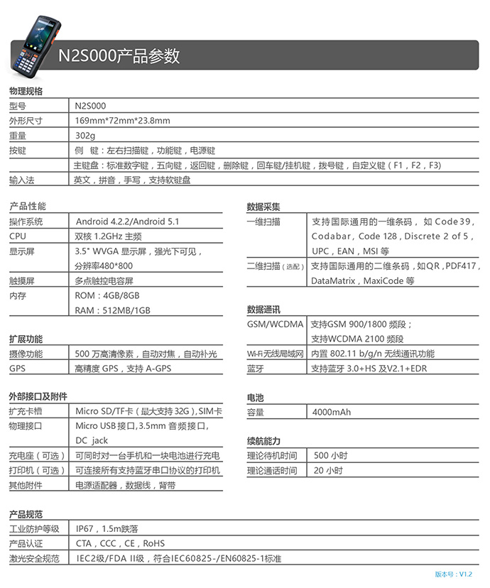 N2S000是一款綜合性能高、適用領(lǐng)域廣的新一代安卓智能終端,25度黃金掃描傾角、電容觸控功能全面。