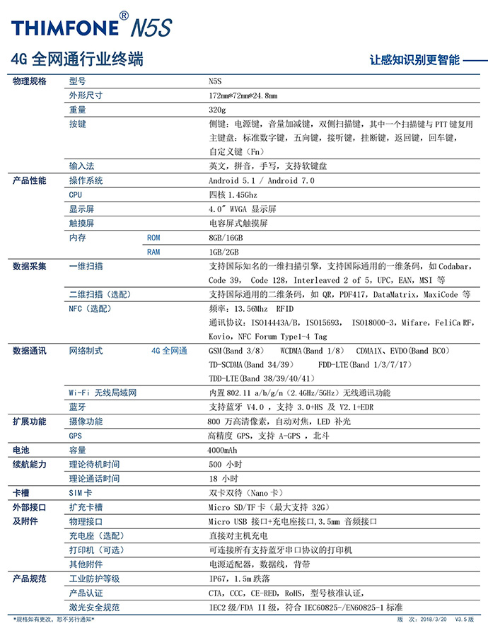 N5S是智聯(lián)天地最新推出的一款基于4G網(wǎng)絡(luò)和安卓系統(tǒng)的行業(yè)終端;采用六面多維度包膠設(shè)計(jì),完美融合美學(xué)與三防;4.0寸主流高清顯示屏,同時(shí)具備了多顆專業(yè)的1D/2D掃描引擎。