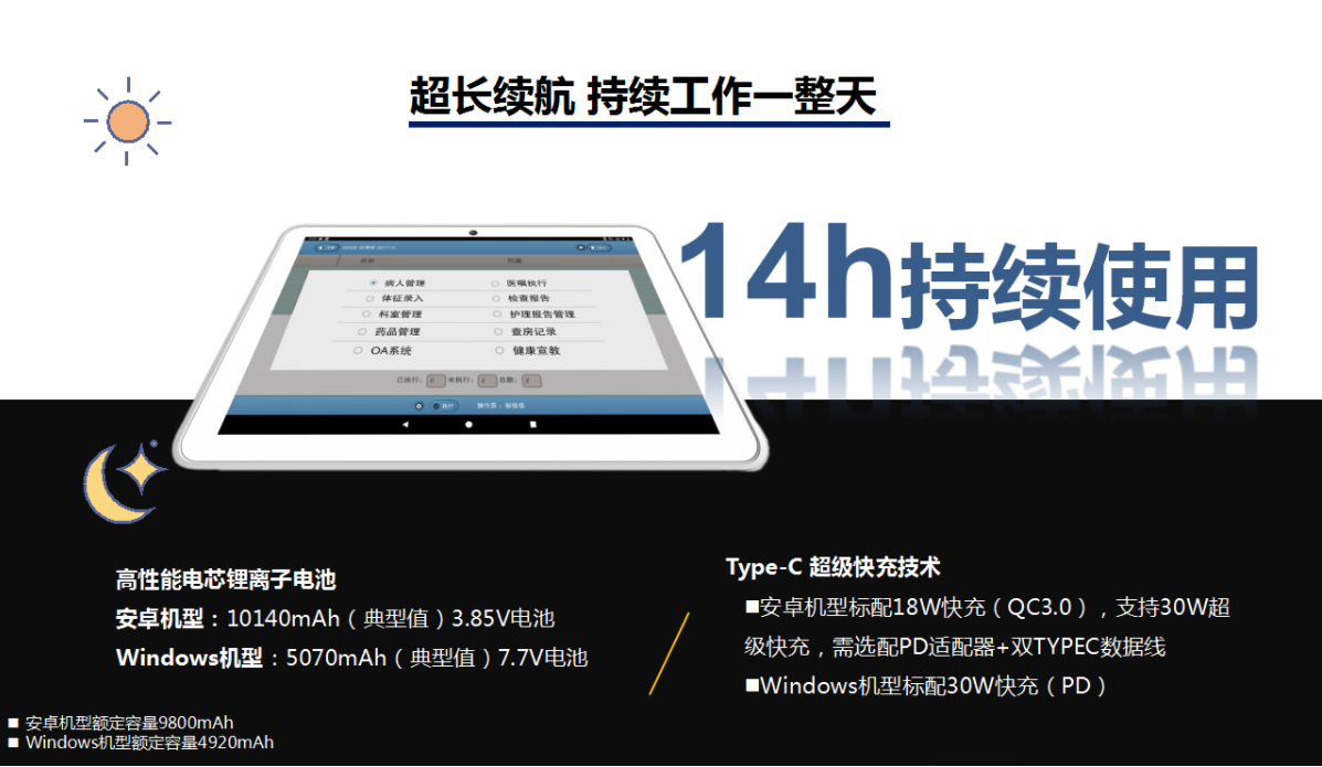 電源:底部觸點接口DC IN:最大輸入功率27W;不可拆卸100140mAh(典型值)鋰離子充電電池,額定值9800mAh;USB TYPE-C接口,支持QC3.0充電,最大功率18W,最大電壓9V