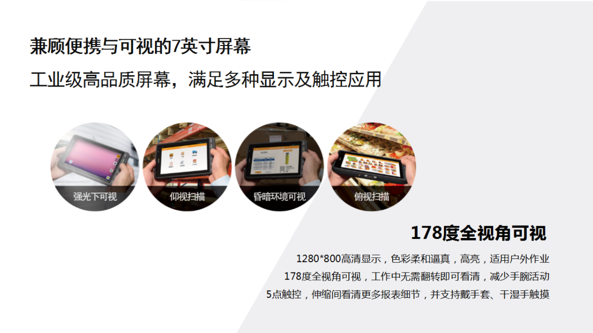 顯示屏幕:7英寸全視角液晶顯示屏,電容式觸摸,支持戴手套/帶水觸摸/被動(dòng)筆;1280(H)×800(W)WXGA
