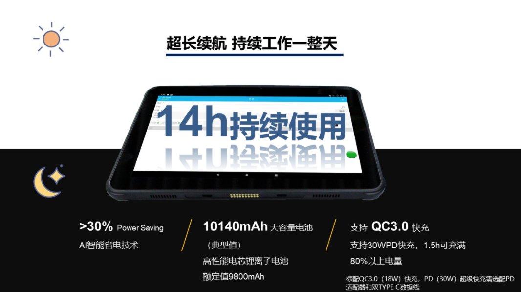 電源:部觸點(diǎn)接口DC IN:最大輸入功率27W;不可拆卸10040mAh(典型值)鋰離子充電電池,額定值9800mAh;USB TYPE-C接口,支持QC3.0充電,最大功率18W,最大電壓9V