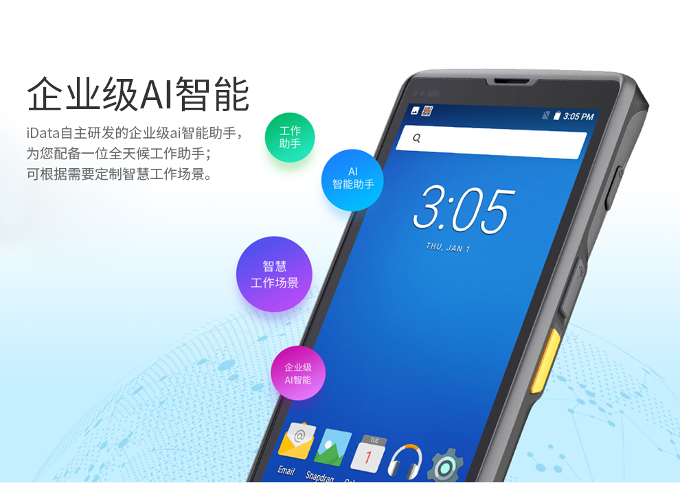 iData 80智能手持終端,超大屏幕,5.7英寸全面屏帶來(lái)更廣闊的視覺(jué)體驗(yàn),高通8核CPU配置,性能強(qiáng)勁,適配多種掃描引擎,多種通訊方式,滿足多種掃描場(chǎng)景需求,iData自主研發(fā)的內(nèi)置ai智能助手,依需智慧定制工作場(chǎng)景。