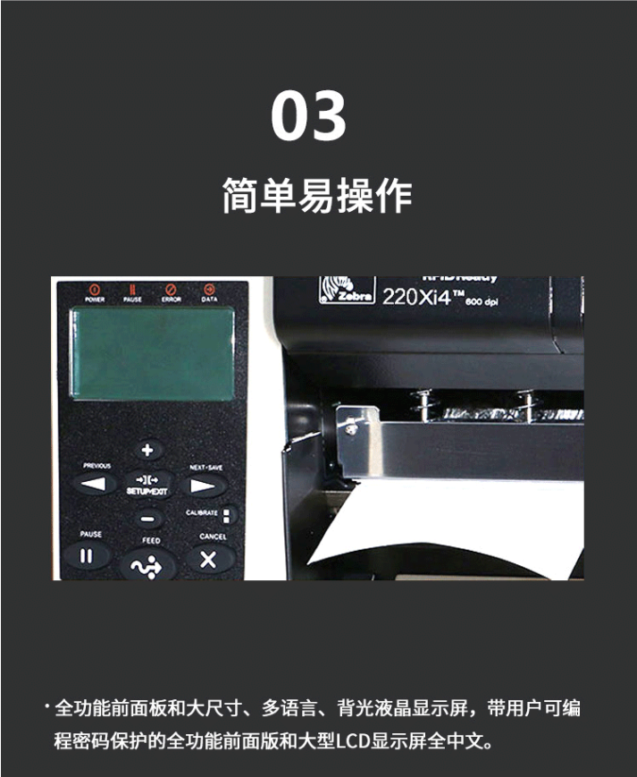 斑馬220Xi4 工業(yè)打印機,專為大批量應(yīng)用和惡劣環(huán)境而打造,熱敏熱轉(zhuǎn)印兩種打印模式,300dpi高清打印頭,全功能前面板和大尺寸液晶顯示屏,設(shè)置方便。經(jīng)久耐用的設(shè)計,可提高更嚴苛環(huán)境下的工作效率。值得信賴的高速打印和出色品質(zhì)。